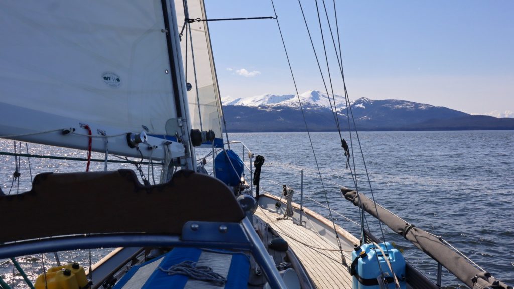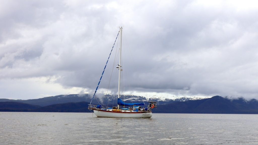 Sailing, instead of motoring, our first day was not planned but oh the joy of turning the key on the Perkins and hear it go quiet with only the sound of the wind in the sails and the water rushing past our hull. The smiles couldn’t be wiped off our faces. For the next three hours we would sail in a very kind and gentle breeze towards our destination of Admiralty Island National Monument, all while re-learning how to sail. It seemed that we lost some of the basics to memory, but they were quickly come back with the exercise. It was perfect spinnaker-sail weather but neither of us were in a rush, nor did we want to go through all the effort of raising the big sail just yet. Instead, content to just go slowly towards our anchorage where we eventually dropped our anchor into the water for the first time in those eight long months.