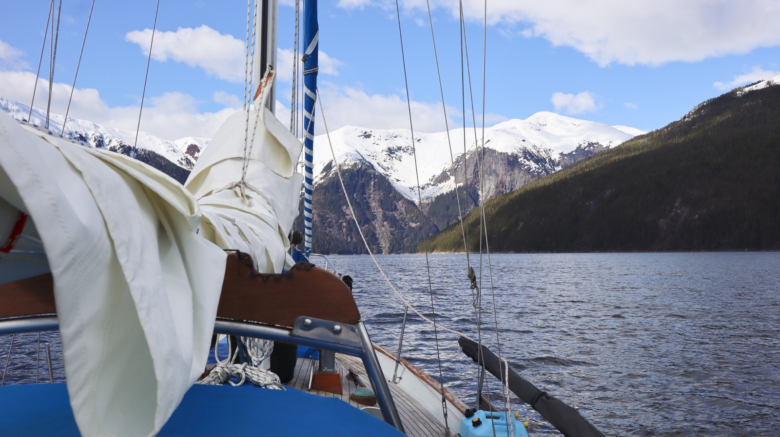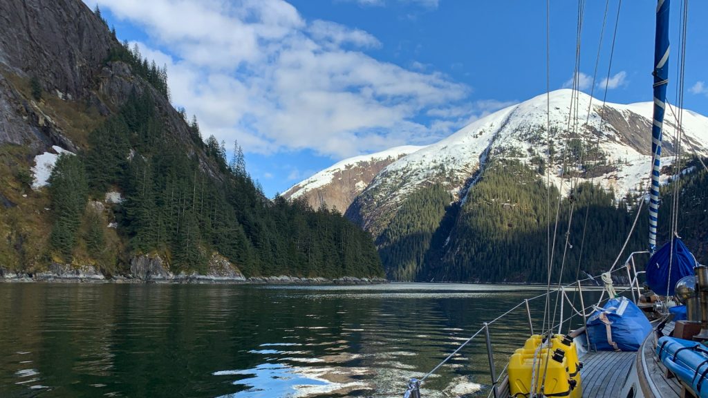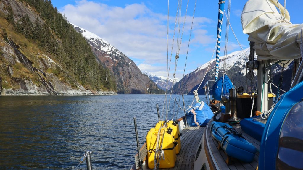 Sail down and re-packed, along with a few more hours of the old Perkins rumbling away, we arrived at the tight entry to Tracy arm. Cruise ships come in here, yet the entry seemed barely wide enough for Meriwether. Get it wrong and we run a-rock. Get it right – with the current in our favor – and we shoot out the other end like a cannon. Cannon it was. We were officially in Tracy Arm… but the day was only half done.