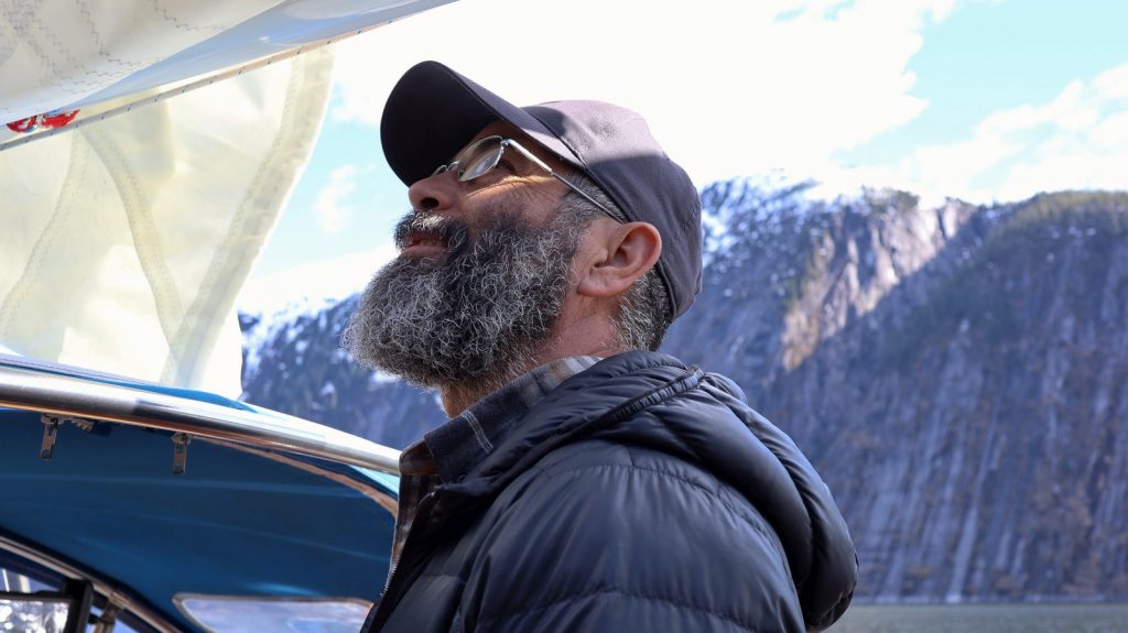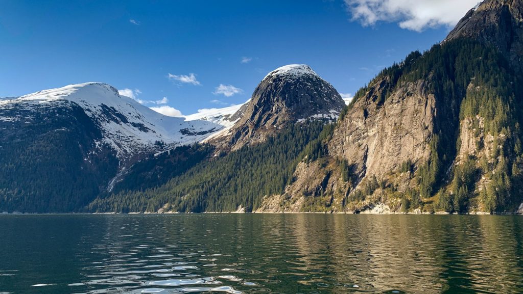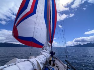 When talking to others about us spending a few sailing seasons in Alaska, one location came up as a “must see”, from those that have been to Alaska, more often than any other; Tracy Arm. It is difficult to accept that a single spot could be the defining locale for all of South East Alaska, but that was the ticket being sold. Tracy Arm is a short power-boat ride from Juneau, with regular tours being offered to anyone wanting a small Alaskan adventure. For us, it involved another long day on the water, this time mostly motoring. We did have a perfect tail-wind to go through the near-herculean effort of rigging up and hoisting the spinnaker sail, which we did only for the wind-gods to snicker at us as the breeze fell to exactly zero within minutes. It was good to bring out the big sail nonetheless, at the very least to stretch its muscles after the long freeze of winter.