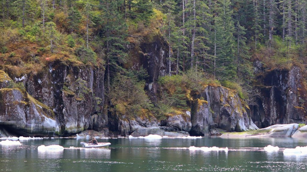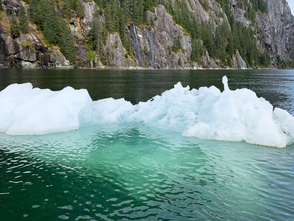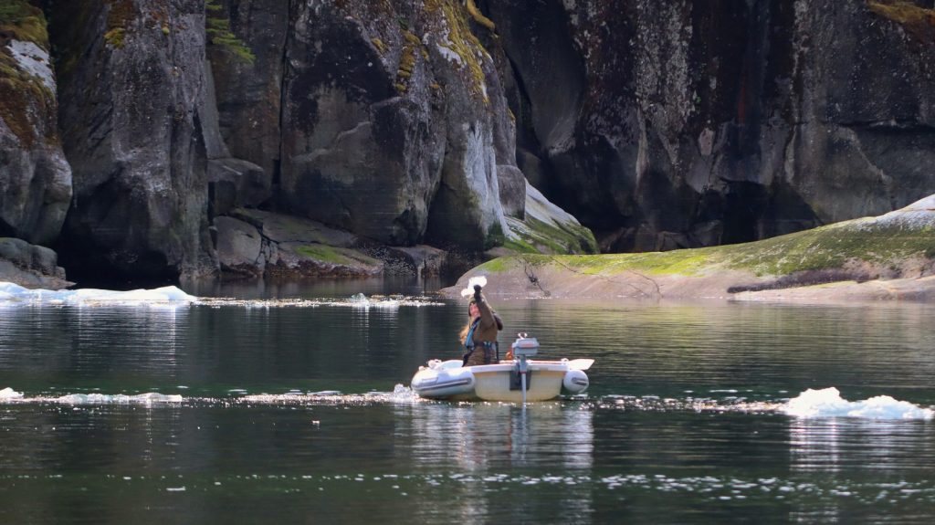 With time in hand, and a bunch of small bergs surrounding us, Kerri got the bright idea to drop the dinghy into the water and go chip off a chunk of glacier ice for our evening cocktails. It is a careful balance approaching an iceberg in a small boat. Not only is the common knowledge of ‘you only see a small portion of the berg’ still true, but they like to roll on you… literally on you, when in a tiny little boat. So while I stayed on Meriwether – motor running, ready to come to the rescue, Kerri approached and snatched a chunk that was suitable for drinks. Much of it is still in our chest freezer as I write,10 days later.