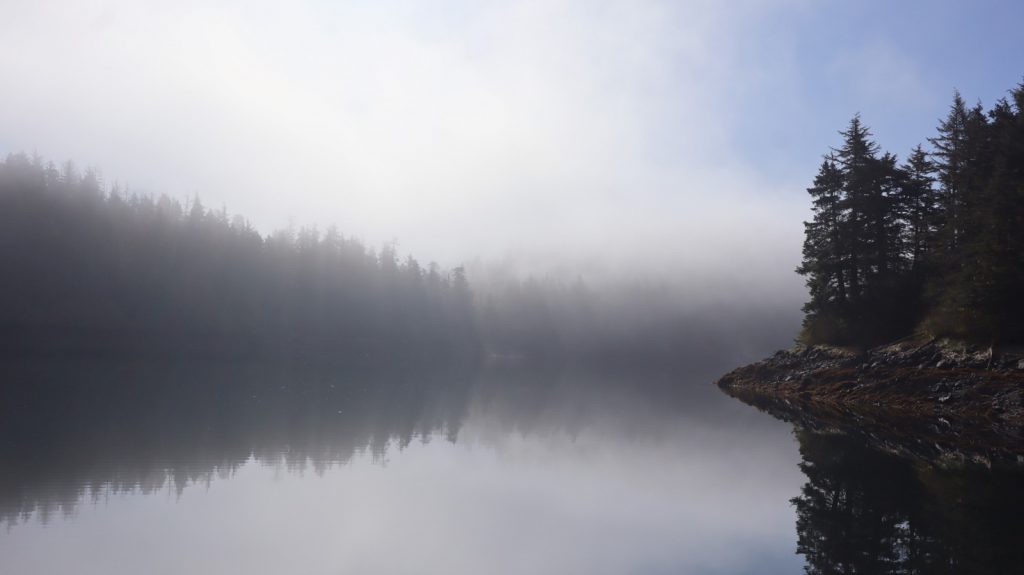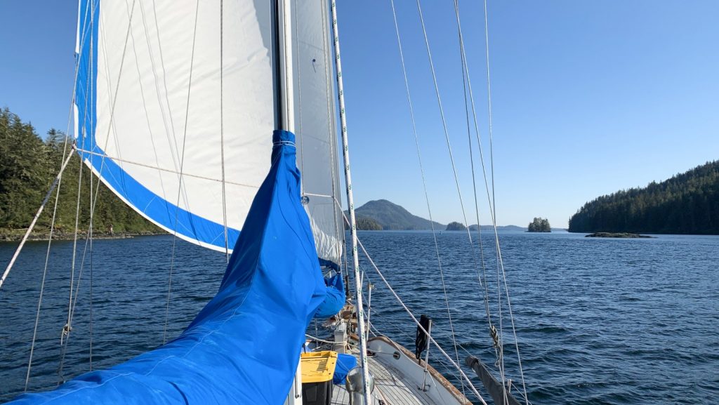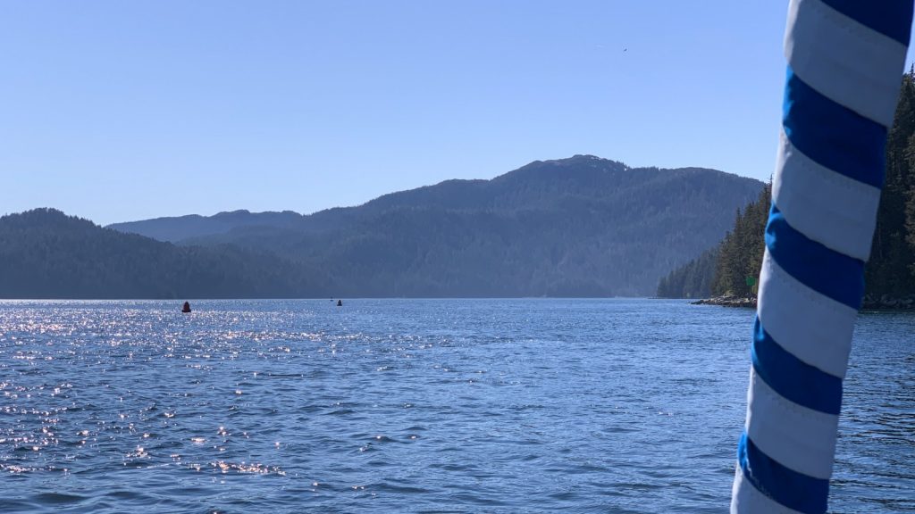 We chose to stay on our planned route, turning South and towards Sitka. Even though we were still in tight channels weaving between islands, the ocean-view gave us a nice breeze in the direction we were going. So, with Kerri’s uncertainty, I rolled out the headsail and sailed us through the next pass and narrows on our way to Mud Bay, on the East side of Kruzoff Island, where we thought we would have a peaceful final evening before arriving in Sitka, but instead found an ATV tour camp on the shore making all sorts of ruckus. To each their own I guess. We still slept well.