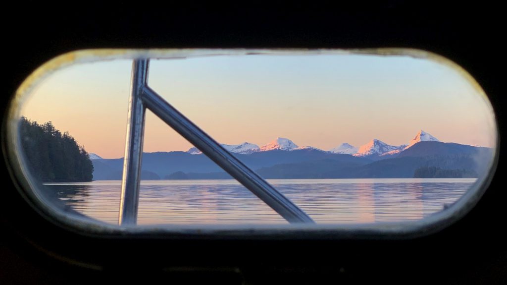 By early afternoon we were ready to get moving again, and did just that. Though the phrase “hold onto your cockles” was coined as we approached the mouth of the Sergius Narrows, we passed through with no drama to speak, and continued motoring towards Sitka. After a few more hours we rounded a particular point and were greeted with a view of the open waters of Salisbury Sound, which is open to the Pacific. From here we could turn West and sail directly into the ocean, past the sunset, and off to another continent – the first time we had such an option since last May. It was exhilarating.