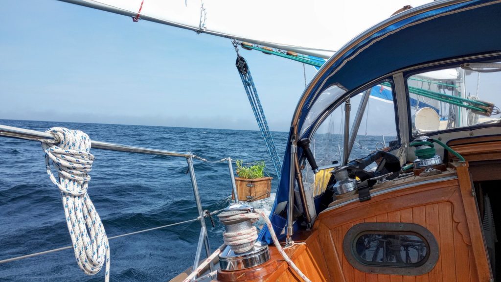We would be able to raise our sails within a half-hour of pulling up our anchor. From that point, we were able to hold a single course, with the wind on or quarter, for more than 60 miles. And *that* is why I wanted to sail across open waters; a bit of consistency. It was our longest single-heading sail, meaning we made no adjustments to boat or sails. This has been completely unheard of in our sailing career. Sailing in the Puget Sound, BC, and Alaska means constant sail and heading adjustments. Rarely is there time to relax at all. This trip was hours and hours of holding that single course. The worst of it being the following swell that would rock the boat violently every few minutes.