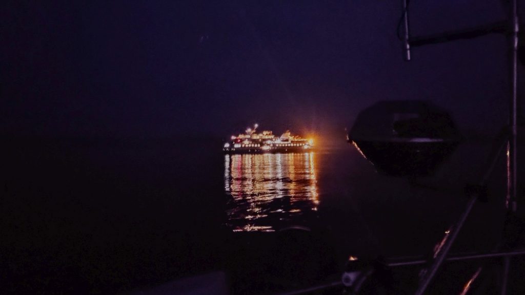 The sun would set. Kerri and I would trade off shifts. She got some sleep, I was still too excited to do so. Before the next day’s sun would show itself, we would pass by – within a mile – a couple large cruise ships, with all their lights making them very obvious miles and miles out. It was all there really was to see, although Kerri did report some bioluminescent jelly fish blinking their disgust at us as we sailed over them. I did not see them personally, so I can not confirm her story.