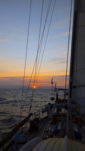 The sun would set. Kerri and I would trade off shifts. She got some sleep, I was still too excited to do so. Before the next day’s sun would show itself, we would pass by – within a mile – a couple large cruise ships, with all their lights making them very obvious miles and miles out. It was all there really was to see, although Kerri did report some bioluminescent jelly fish blinking their disgust at us as we sailed over them. I did not see them personally, so I can not confirm her story.