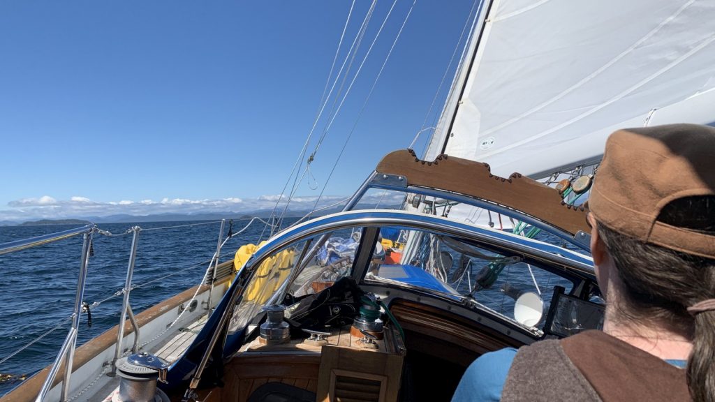 And what a day sailing it was. Sure, we had a couple hours of motoring, with the current in our favor at least, to clear some islands. Once clear, the wind filled in as forecast (what?!?!) and the sails came out for the rest of our day. The wind was not too weak. Not too strong. But just right! There was a bit of our old game of log-dodging, which we won at once again… thankfully. We even got a last minute visit by a local whale right off our port side. It was the closest whale we have encountered this year, and he didn’t seem to care we were there at all.