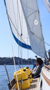 The next day we set out to ride the wind once again. First with the spinnaker (again, their first), then with all three sails out and beating upwind to no real destination. We eventually turned tail (aka jibe) and worked our way right where it all began; right in front of Port Townsend, where we unanimously decided to drop the sails, lash the boat to the nearest open dock, and go have a greasy meal. In the end, the new sailors spent nine hours sailing, racking up some very important experience to add to their log books (ah, I remember the log books).