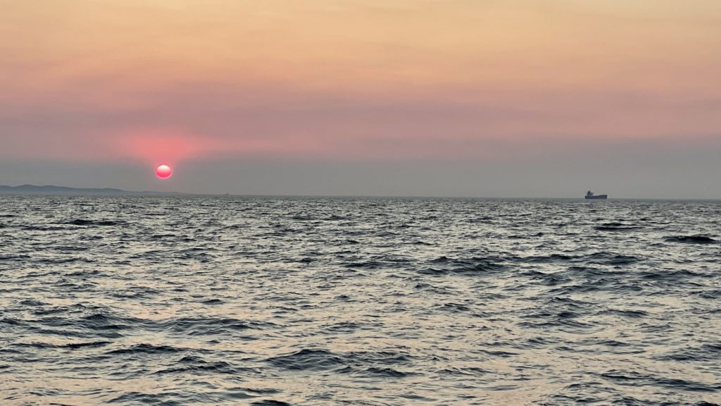 In the hours before pulling into Neah Bay after the sunrise, Meriwether was sent off by a crowd – literally dozens – of humpback whales in the Strait. Cameron and I spent an hour watching them feeding all around us, while Kerri slept after her overnight watch. In the four years we have spent up in the Puget Sound and Alaska, we have seen our fair share of whales, but this was the most at one time, by far… not that we have any photos to prove it.