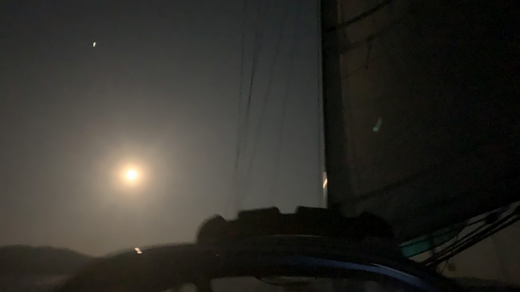 Cameron learned all the systems on the boat: how to reef, and shake out a reef, the auto pilot, as well as all the other lines and blocks required to move Meriwether through the water. The nights came and went, with each of us taking 4 hour shifts with some overlap to enjoy some company from time to time. A full moon kept us well lit though most of each night, making life even easier on watch. After a few days had passed we knew we would not make it in front of the storm – which, by the way, was being reported as a typhoon by some new outlets. Californian’s do consider a small rain shower as a 100 year flood, so “typhoon” may have been a bit strong for the real world. Still, 40+ knot winds, in our face, are not our cup of tea.
