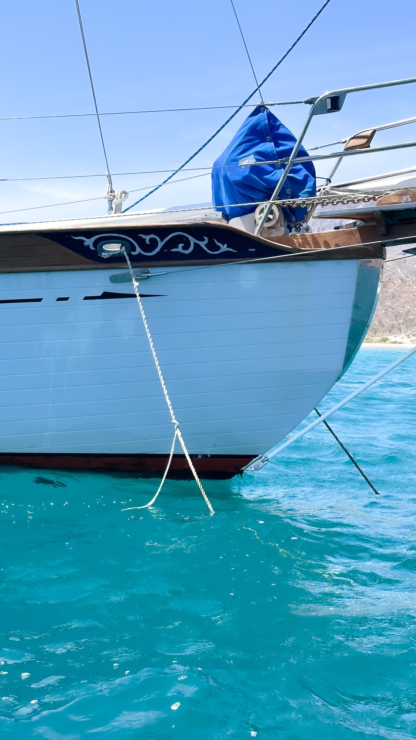 We finished up our stay without any further incident but for the failure of our anchor bridal. The line, used to dampen the tugging of the anchor chain on the boat, had finally met its match in the week long wind. All the tugging, and rubbing on a bracket, finished it off. Luckily, we had a spare and thanks to other Baba owners we had met recently, we had a new idea how to do a better bridal/snubber that should prevent this from happening again.