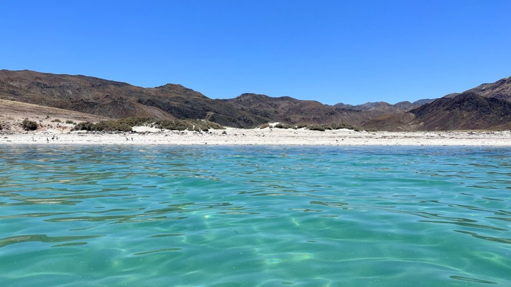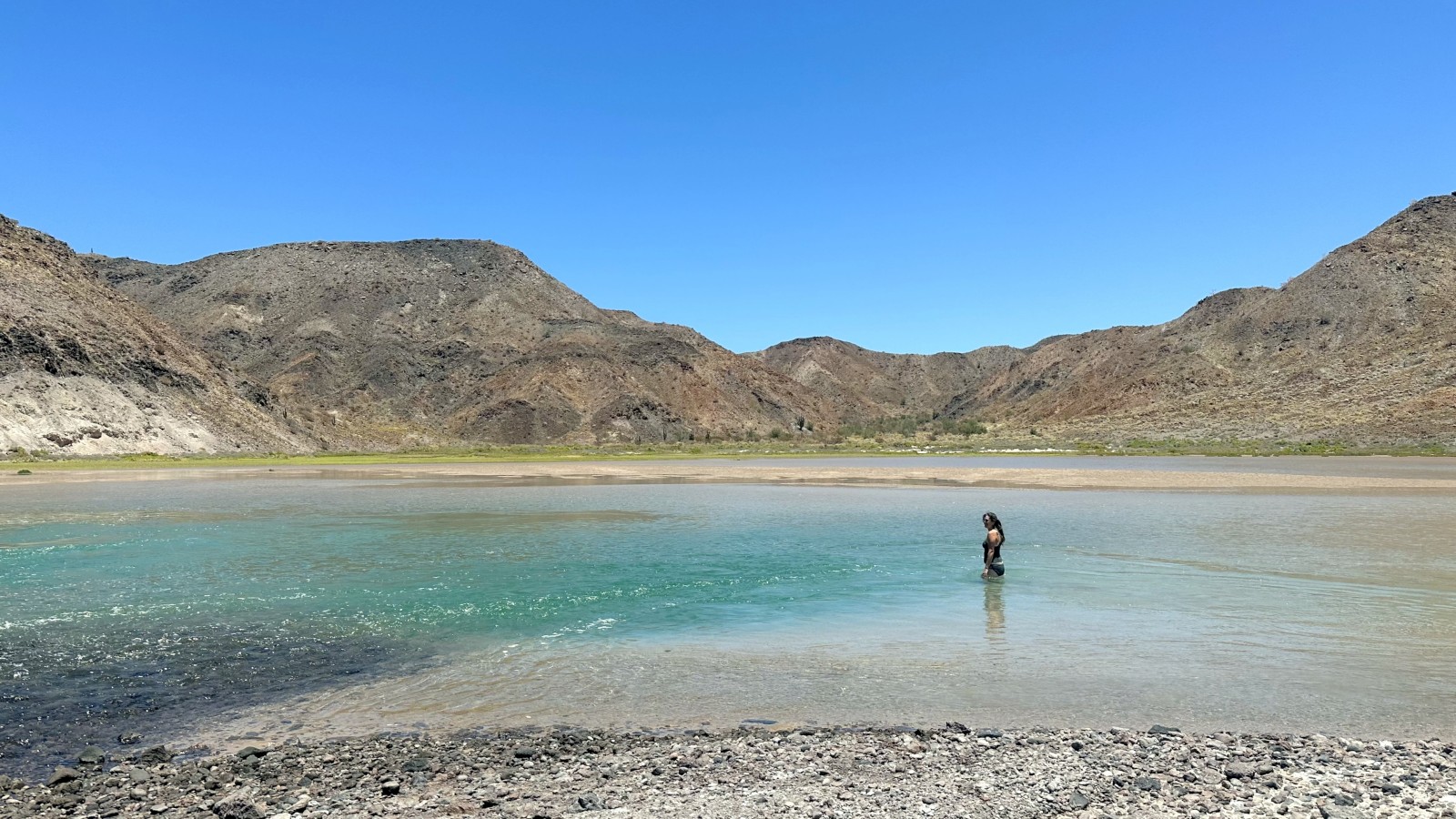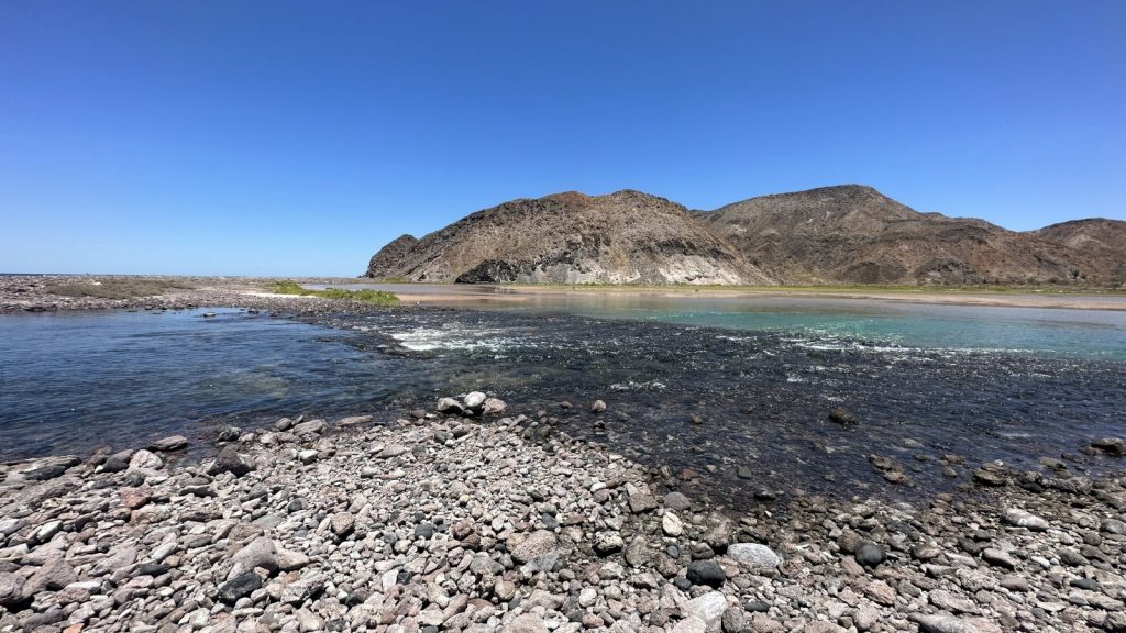What we found, by chance, was on a rising tide the sea water would flood into a large lagoon at the back side of the bay. This flooding would making some rapids of sort. On the lagoon side of the rapids was a large pool dug out in the sand from the force of the water, making for an amazing place to take a dip, which we promptly did. It was just what we needed on a hot day in Baja. It was a beautiful place to be at the very moment and we knew it and tried our best to soak it in.