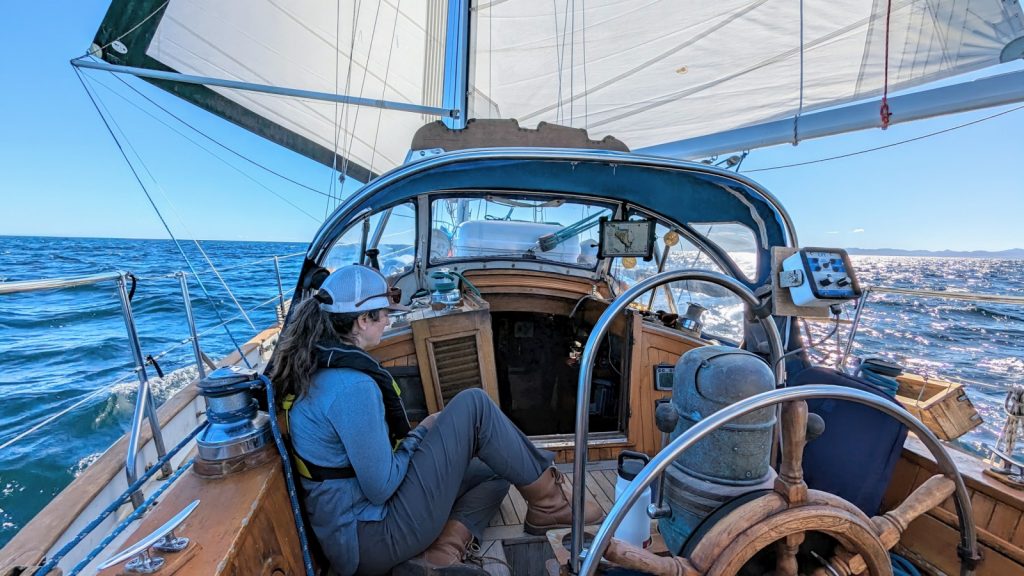 It isn’t the the most difficult fix, but does require a deep dive under the cockpit with a headlamp and a few soon-to-be sore muscles to get in there to tighten a few bolts. The problem I ran into was that I could not access the bolts unless the steering was set to full port so they would rotate my direction. This we could not do while still at sail, so we rolled in the jib, and dirty-dumped the main which still had a lot of wind in it. The dirty-dump, along with a poor decision on my part to fully loose the topping lift, allowed the boom to miss the gallows and give our Starlink dish a hefty whack. The internet was out, but we would have to deal with that later. Once we were motoring we could steer full port and try to remedy the problem, but alas, I was not able too. Instead, we kept motoring and hand steered the final two hours (in great wind to sail) which we both regretted. The sea state was such that our boat was severely rolling back and forth with no sails up. It was uncomfortable for sure, but not unsafe.