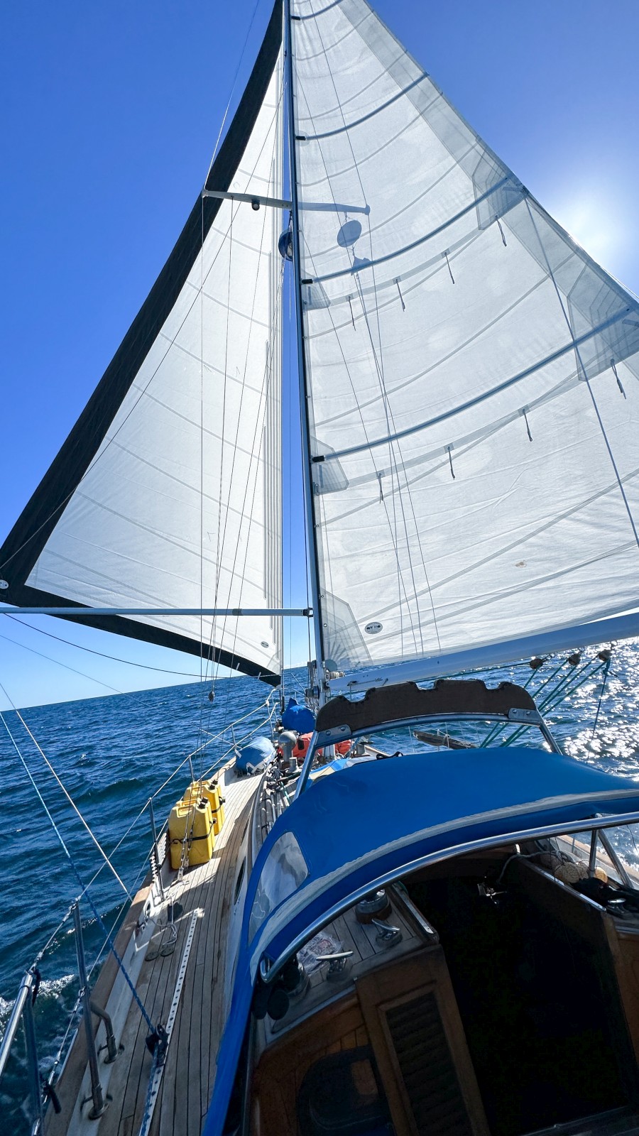 It isn’t the the most difficult fix, but does require a deep dive under the cockpit with a headlamp and a few soon-to-be sore muscles to get in there to tighten a few bolts. The problem I ran into was that I could not access the bolts unless the steering was set to full port so they would rotate my direction. This we could not do while still at sail, so we rolled in the jib, and dirty-dumped the main which still had a lot of wind in it. The dirty-dump, along with a poor decision on my part to fully loose the topping lift, allowed the boom to miss the gallows and give our Starlink dish a hefty whack. The internet was out, but we would have to deal with that later. Once we were motoring we could steer full port and try to remedy the problem, but alas, I was not able too. Instead, we kept motoring and hand steered the final two hours (in great wind to sail) which we both regretted. The sea state was such that our boat was severely rolling back and forth with no sails up. It was uncomfortable for sure, but not unsafe.