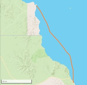 From our last anchorage to Santa Rosalia is 75 nautical miles of open water with no safe anchorages along the way, so it has to be done in a single voyage. Moving at barely the pace of a New York City jogger doesn’t get you through 75 miles very quickly; about 14 hours in total. At this time of year there are only 10 hours of sunlight each day, and we always want to try to get our anchor down before full dark. This is why we attempted to depart our last anchorage at 3am, which turned into nearly 4am after being attacked by the seaweed monster.