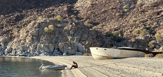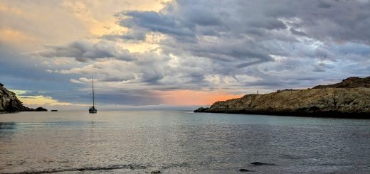 Kerri is no fan of the rolling seas that come with down wind sailing, which we have been in since leaving Penasco. When she feels uncomfortable we start making choices based on that discomfort and not sticking to our well thought our plans. Such as jibing the boat sooner then planned, which caused us to sail towards land too soon, which in turn caused us to have to drop the sail (or jibe two more times, which we didn’t care to do) sooner then planned and in the worst of conditions. By the end, we were both pretty grumpy and it showed. Still, a 14 hour day at sea with 12 of those hours under sail felt great and once we were at anchor the rest of the B.S. fell away and we moved on.