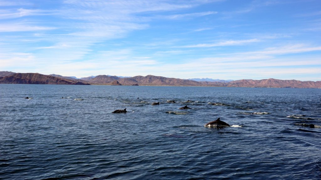 The next day, after six of them in total, we pulled up our own anchor and motored the 20 miles into the Bay of Conception, choosing to motor as our battery bank was heavily depleted. Mid way through our short hop we were welcomed by a good sized pod of local dolphins who played with Meriwether for only a few minutes before growing bored and diverting course back to their daily migration to who knows.