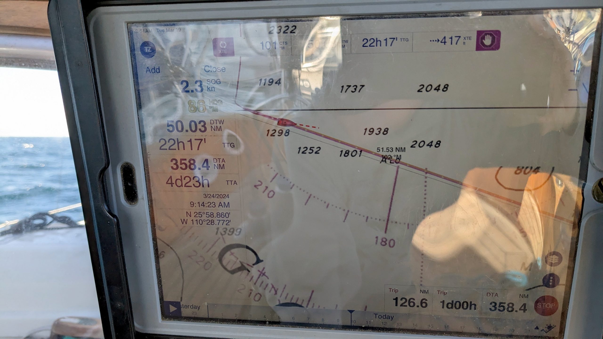 Not a whole lot happens over a 5 day sail, 40 miles off shore. We only begun to see other boats on the final one and a half days, as we got closer to Mazatlán. We saw only a single whale, and to the best of my recollection no dolphins came out to play with Meriwether. The wind was fairly nice to us, with good down-wind sailing winds from sun up to sun rise. In fact, we sailed for 33 hours straight on days 1 and 2. Usually, after sunset, the wind would calm to the point that the old Perkins would be called to action for 10-12 hours until sunrise.