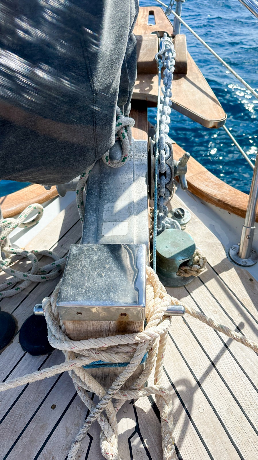 We had to tie a knot to it with another rope, haul it up by hand using a winch, until we could free the knot. Then take the anchor rope again back to the other winch on the mast and start hauling in the anchor rope again. This went fine until the chain was just about to come over the bow roller again – read maximum chain weight – at which time the winch itself broke. Another round of safety ropes an hauling it in on another winch until the chain was just about to come over the bow roller again which is where we stopped.