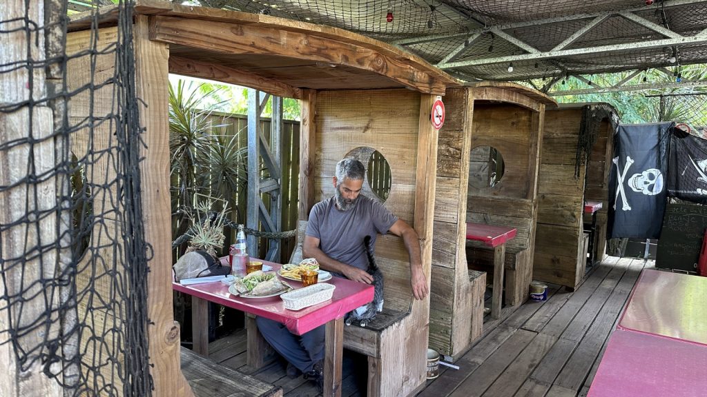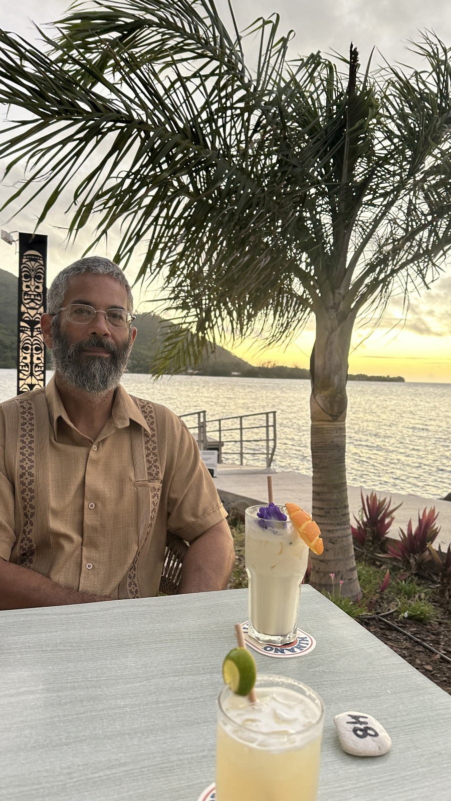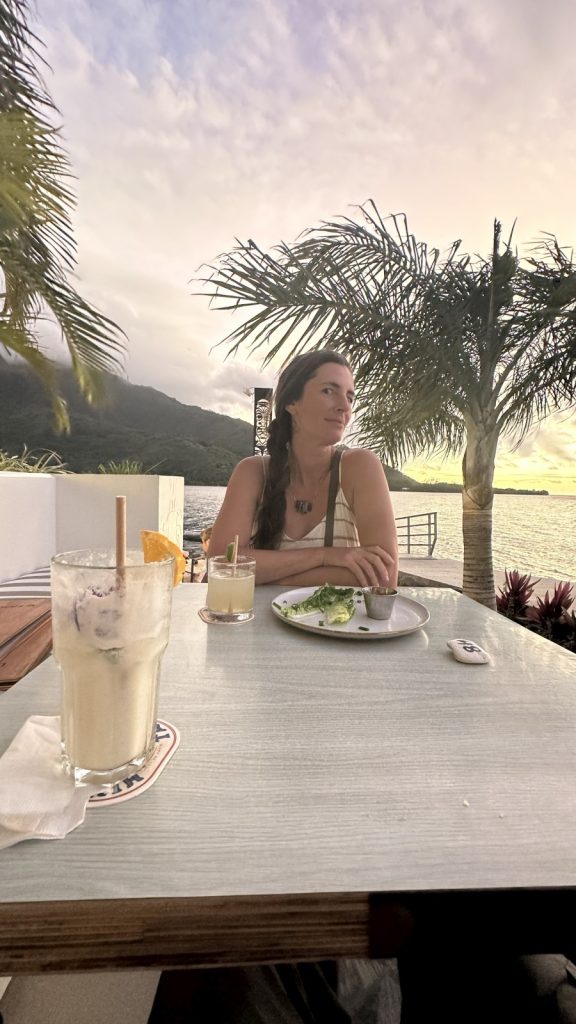 At three nights, it was far too short of a stay in Mo’orea. The anchorage at Cook’s Bay was calm and protected, and the quiet bustle of the easy life of both humans and birds from the shoreline was soothing. But, it seems like cruisers have a better chance than not of coming down with a bug after leaving Tahiti, and Tim succumbed to a bad head cold that knocked him out for most of our stay. So we missed so, though I got to explore the island a bit more than him, we did miss some good hikes, a juice/distillery tour, etc. The last night he was feeling better, so we got to finally have a nice happy hour and dinner out. Our first restaurant in all of French Polynesia that wasn’t just a “Snack” place, as they’re called here.