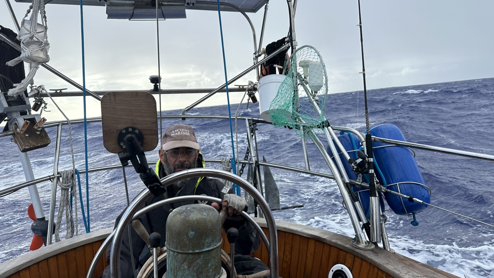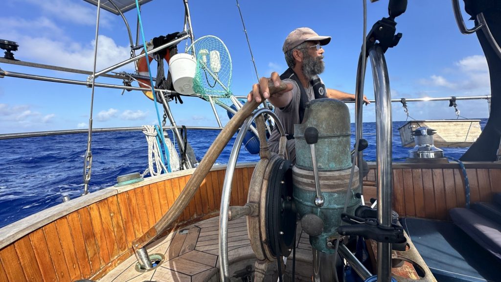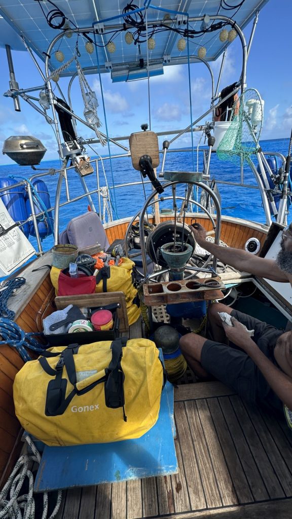 Days more passed and all was smooth. We were approaching our final safe anchorage deep into our 8th full day at sea, 950+ miles since we left French Polynesia. I was on watch while Kerri was getting some rest during the afternoon. I heard a sound that I’ve never heard before, making me pause for a moment to look around. Nothing. A few seconds later the auto pilot made a correction on our course. Then another. Then another. Meriwether was not responding even through the wheel was being turned more and more to the starboard. I moved to behind the wheel, disabled the autopilot, took control of the wheel, and knew it immediately – our steering cable just broke.