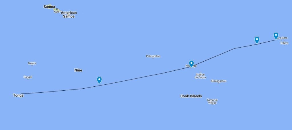 When we left French Polynesia we had anywhere between a single overnight sail to thirteen-plus nights. There is 1300 miles between us and our next major destination of Tonga. How long we would be at sea was fully dependent on the weather from day to day. No forecast could be trusted 13 days out, so we planned our route to pass by numerous safe anchorages which we could run to to avoid foul weather if it poke its head out. These are denoted as pins on the map below, and span four separate countries – which meant Kerri had to prepare entry paperwork for three of them ahead of time; the Cook Islands, Niue, and Tonga.