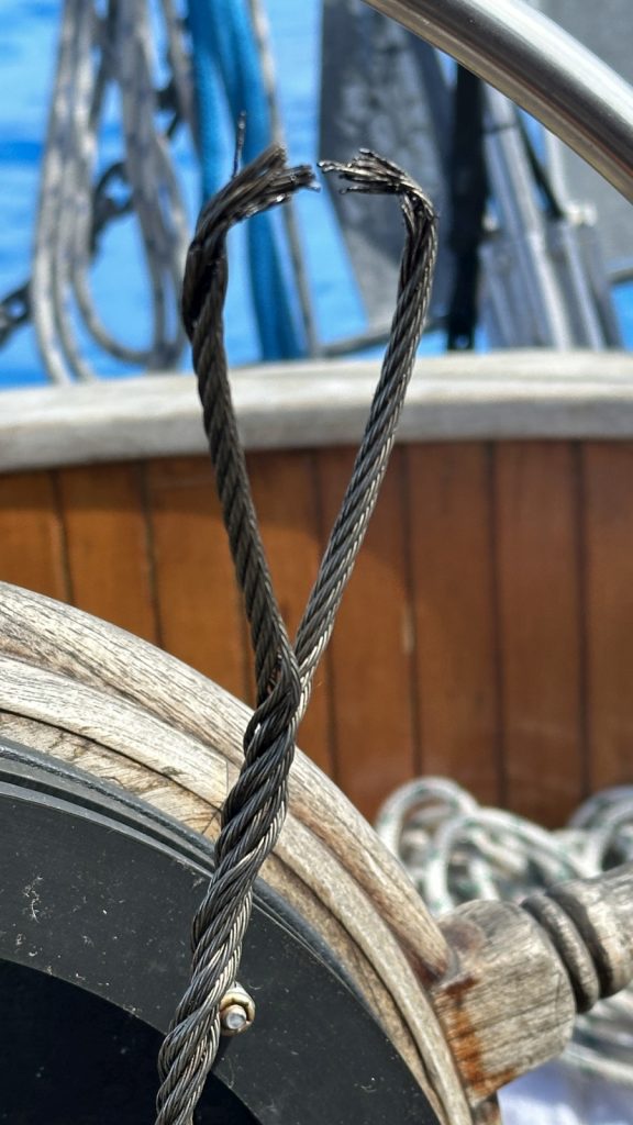 Said repairs turned out to be much easier than first thought. It was the very end of the steering cable that broke, so I snipped a bit off and created a new loop from fresh cable and a few spare cable clamps. Easy as pie, but for having to dig up the entire lazzarette and binnacle to get there. The only real issue was later that night when I thought to myself, “the other end of the cable could be on the brink too!” Kerri woke the next morning and immediately look at my with wide eyes and said, “the other end of the cable could be on the brink too!” So, the following day I did it all again to check the other side which ended up being perfectly fine. As you can see from pic #3, whoever installed our steering system did so by running the cable through a hole at the end of the chain. This is a sharp edge that, after who knows how long, inevitably cut through the cable. Why they did not run the cable around the cylindrical part of the chain link will keep me up at night for many years. Again, I want to stress just how lucky we were to have it fail 90 minutes from a safe anchorage. It could have happened at a much worse time, forcing us to hand steer by tiller for 48 hours without an autopilot – which requires the wheel and cables to function. But, the decision to route ourselves past these safe anchorages so the suffering is minimized when (not if) issues happen shows how smart sailors we have become over the years.