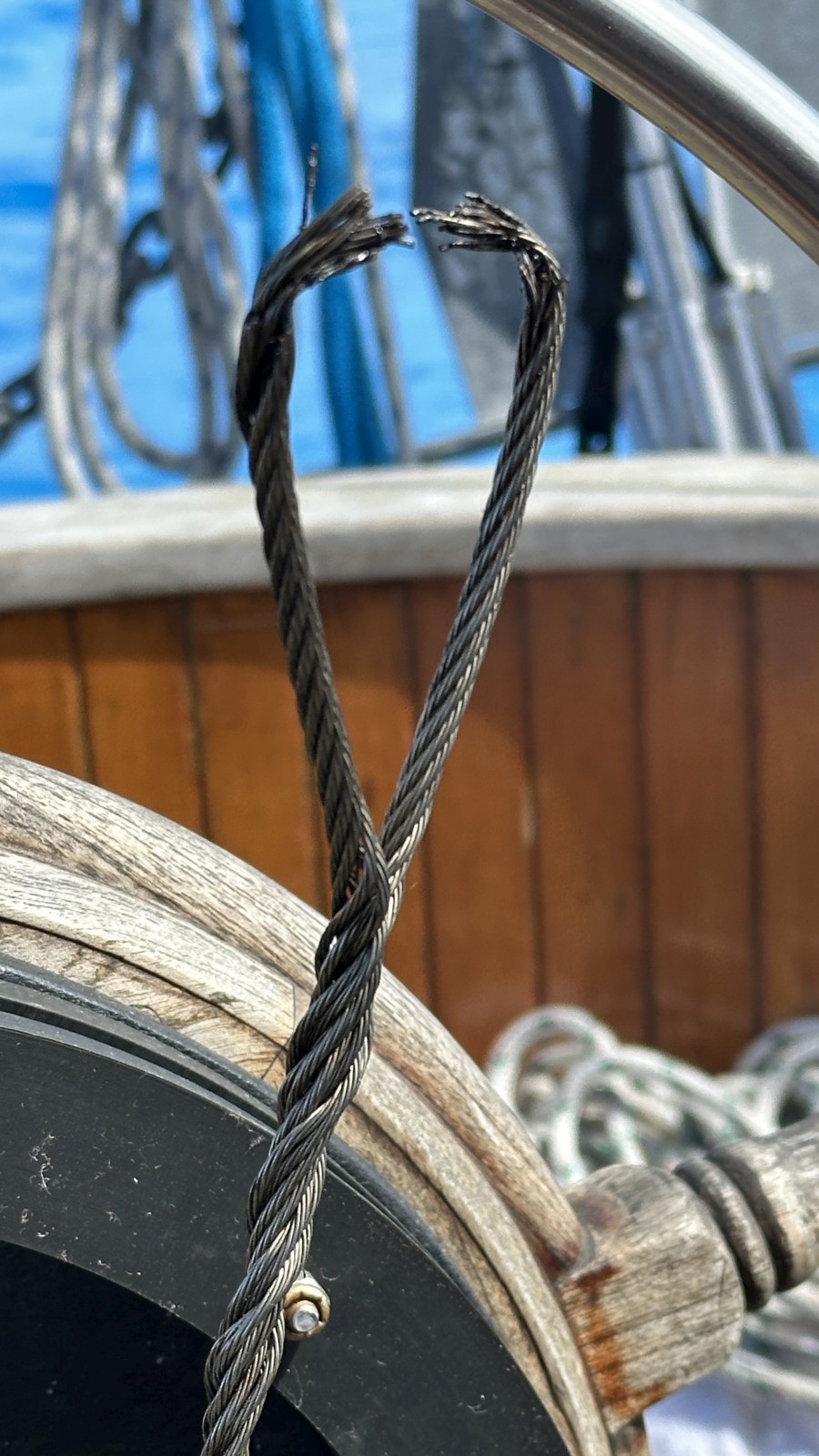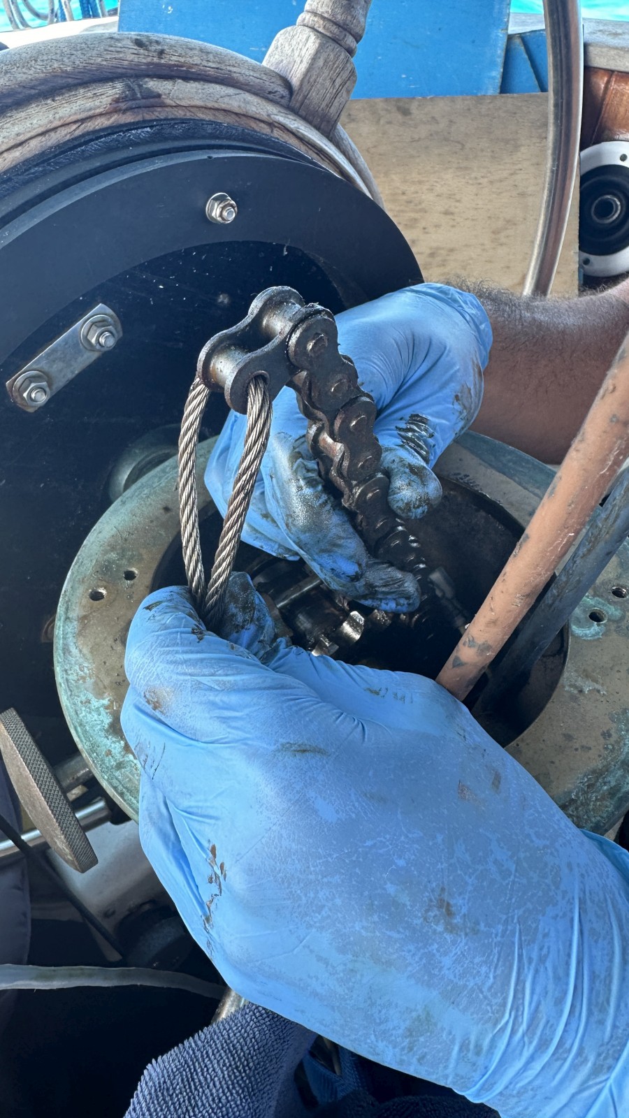 The addtl pictures here clear things up a lot (vs what I saw on Instagram). That is amazing that someone ran the steering wire through the chain link like that. The only correct way to do it is with a cable thimble. Edson sells chain / wire kits with that part already completed. We carried a spare on our last boat.
