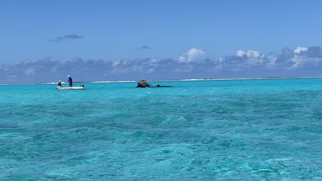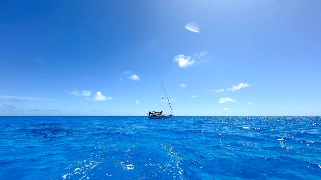 Completely submerged, Beveridge Reef has no land to set foot on. One has to get within a half mile of it to begin to see the breaking waves formed by the shallow underwater coral. The reef itself is roughly 4 miles by 2 miles, the tip of a cone extending from the sea-floor thousands of feet below to within a few feet of the surface of the ocean. It was amazing to just sit and ponder; this narrow pillar of land standing more than 13,000 feet tall and we would be dropping anchor at the tippy-top of it. Take the ocean away, and Meriwether would be balancing on the tip of a needle standing on end. I just couldn’t wrap me head around how it does not just topple over. Once inside and anchored, we had a 360 degree unobstructed view of the South Pacific Ocean. It looks as if we are literally anchored in the ocean itself, but without the 2-3 meter swell that gets mostly tamed by the reef surrounding us. You might think we would be completely alone out there, 900+ miles from French Polynesia and 300+ miles from Tonga, but as luck would have it there was one other boat at anchor when we arrived, and by the next day we had numerous others. They were hiding from the upcoming weather. We were both hiding and had repairs to make.