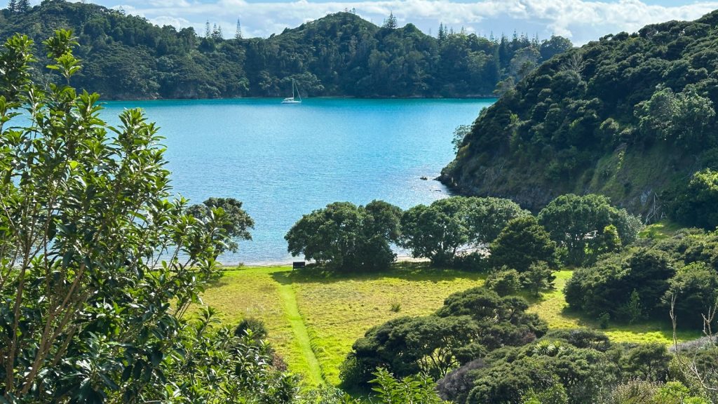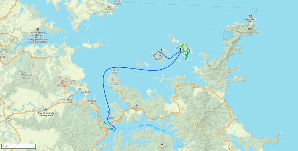 After four days of adventuring on Urupukapuka Island we decided to make a move. Just 1.5 miles away was the smaller island of Moturua Island (3) which offered us protection from the wind forecast to come from a different direction the next couple days. We raised anchor, rolled out the head sail, and shut down the Perkins to enjoy a few minutes of quiet sailing. On top of the wish for quiet, there is still a bit of weariness about the engine/transmission so we are trying to use it as little as possible this season.