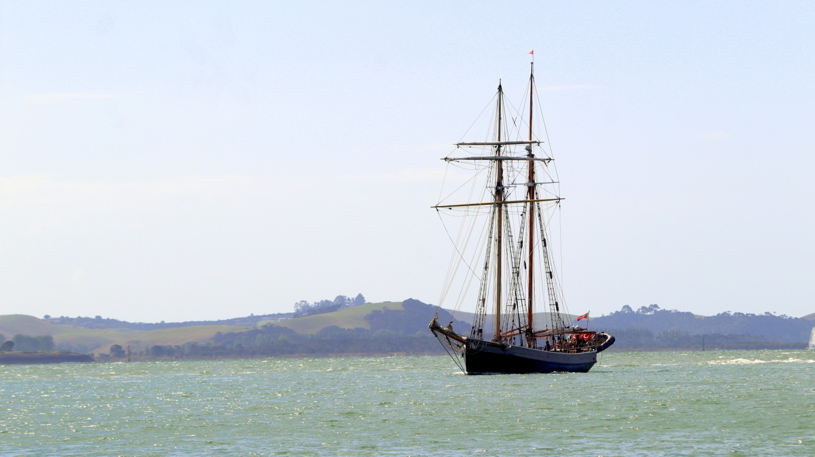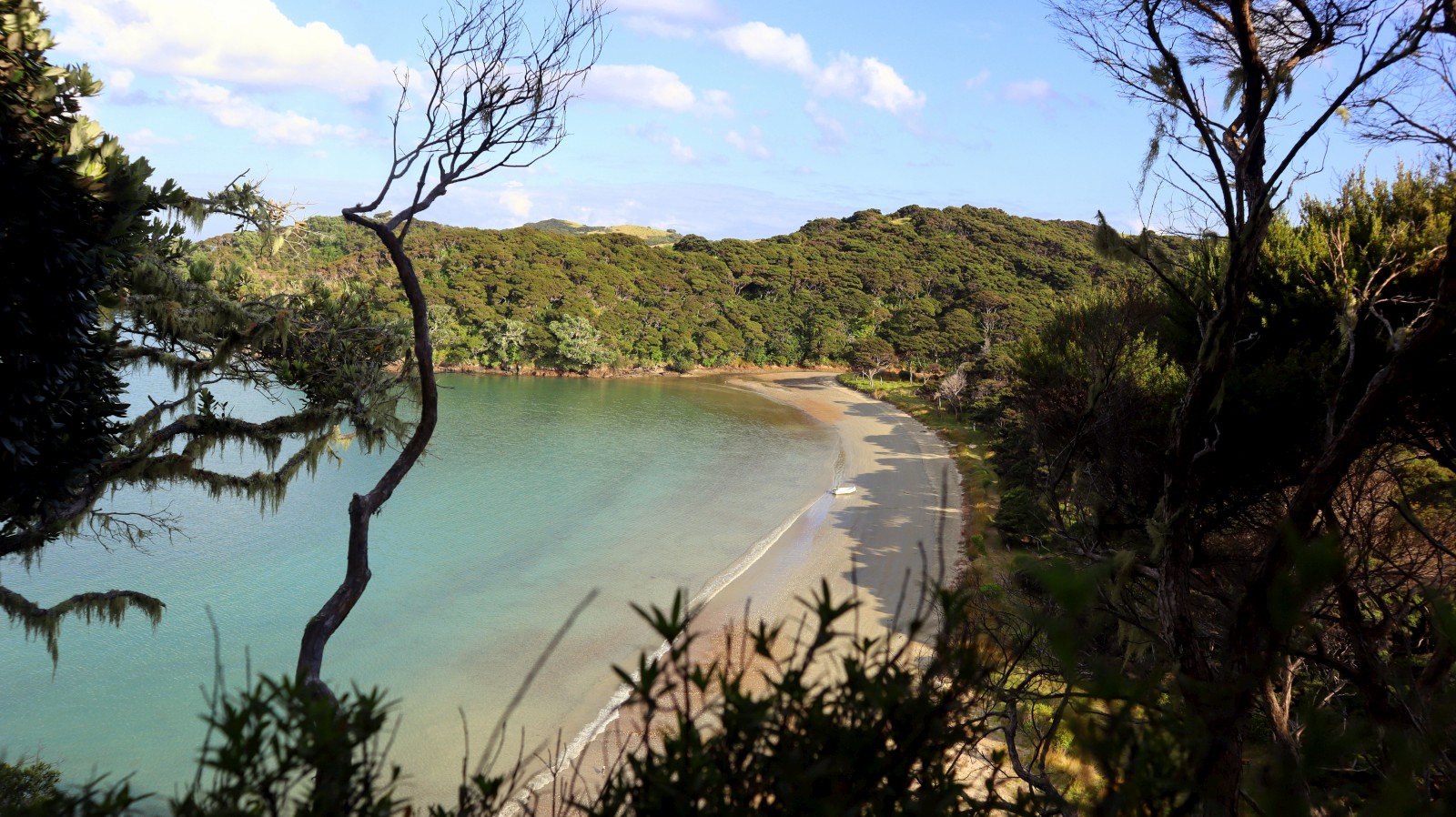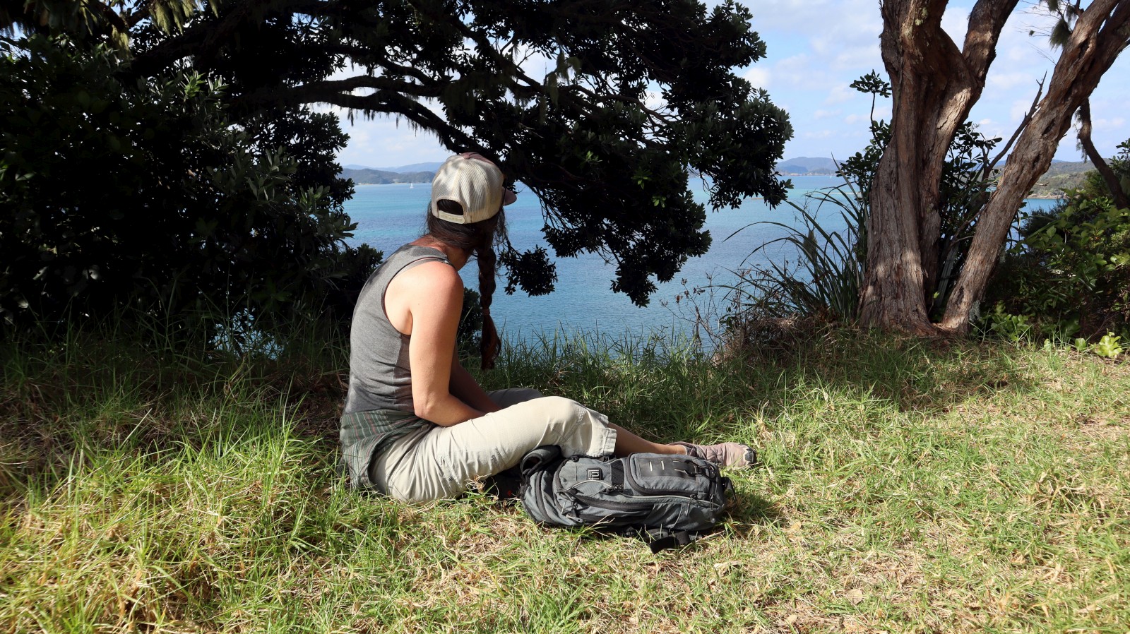 Eventually Meriwether’s bottom was clean enough to move on to more exotic locations. It was a beautiful day to sail, so we hauled out the sails and got straight to it, gently working our way up into the islands of the Bay of Islands. Along the way we navigated past two cruise ships, hundreds of other personal water crafts, and even a paraglider. This place was seriously hopping, and I was quite enjoying the more complex sailing through traffic. Kerri, not so much. At least we did not have an ocean swell, and that was all that mattered to me. Calm waters, sunlight, and a good breeze made for a nice two and a half hour sail to Paradise Cove (2) on Urupukapuka Island.