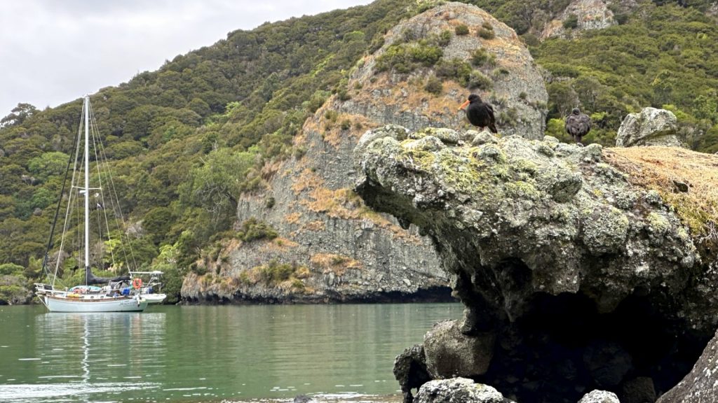 Upon arrival we chose to drop anchor, beside a small houseboat, in the picturesque Wahai Bay (2) with its towering rock formations offering memories of Alaska, just to tease memory of Alaska somewhat. Kerri set out on a solo paddle on a SUP board, while I hung back on Meriwether while the owner of the houseboat dropped in for a meet and greet. The uber-calm waters of being anchored NOT in the ocean swell was fully welcomed by us both, with good sleep a result of the still nights.