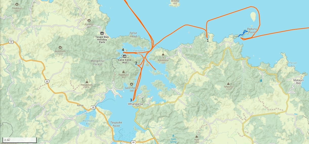 Just a short sail away from our last anchorage (1) is an inlet that provides access to the well protected waters of Whangaroa Harbor, and away from the ocean swell just outside the entry gates. Numerus bays sprinkle Whangaroa Harbor and we wanted to visit a few before continuing north to other adventures. A small village (3) offered the possibility of making it to a grocery store as well, but after calling ahead to ask about a taxi for the 5 mile drive to the nearest market, that idea was nixed.