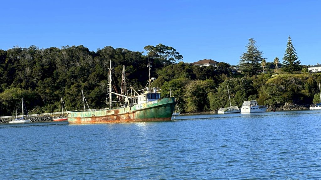 Point B was the small tourist-town of Mangonui. Protected from the ocean by a short inlet, the waters of Mangonui Harbor was nearly completely filled with either private mooring balls or too shallow for Meriwether’s belly. We opted to drop anchor in the middle of the inlet itself, away from all the moored boats but close enough to dinghy into the town itself.