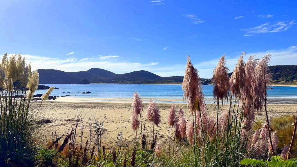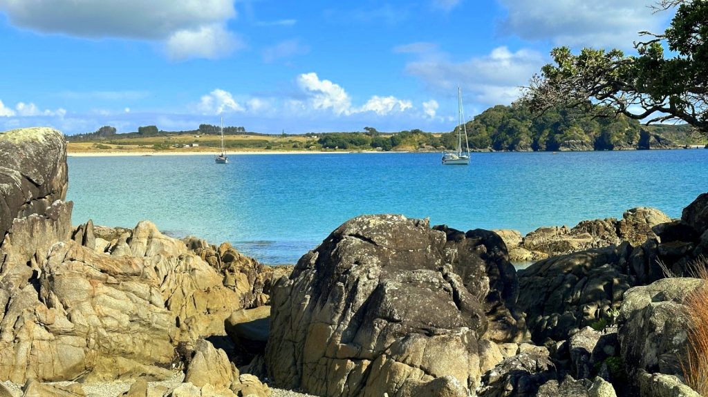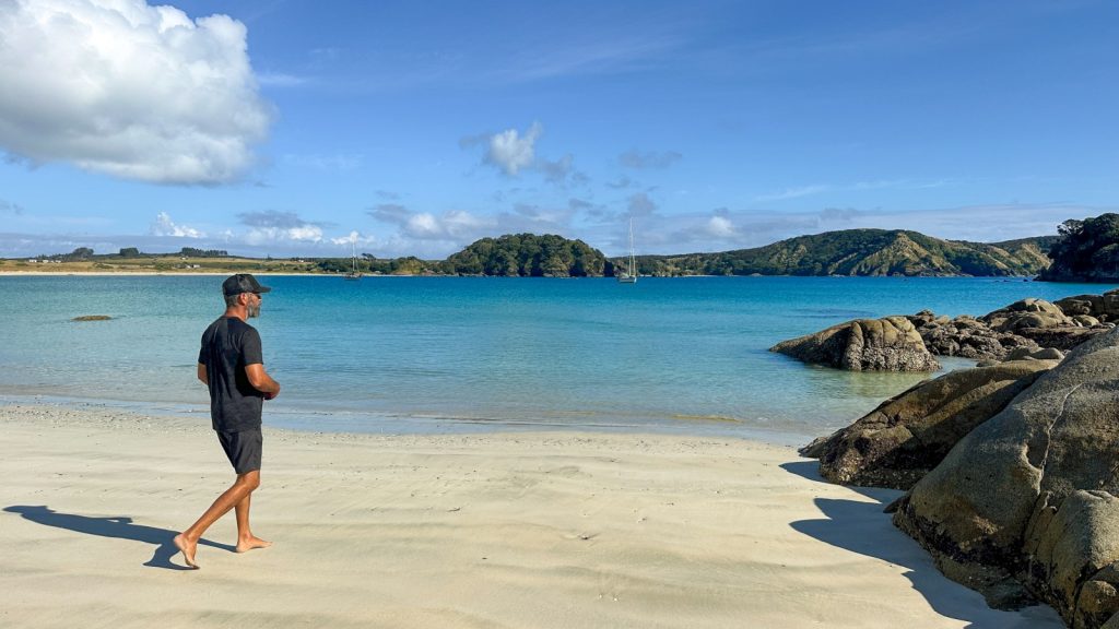 A quick revisit to the grocery in the morning filled our stores once again and with little else to do in town, we picked up anchor and set out further North. The wind had reversed overnight, but we would still be able to sail the majority of the distance – 17 miles in total – close-hauled in calm waters until we rounded Otamatiti Point where Waikato Bay beckoned us in for a stay. Hiding behind a small island from the ocean swell was the only other boat we have seen this far North. Beautiful sandy beaches surrounded us which we got out to enjoy right away.