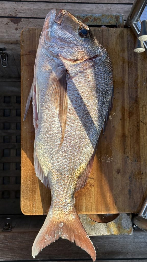 After a couple days catching small fish with my small lure, I tried a larger lure towed a hundred feet or so behind the dinghy at a mild speed. Surprising everyone in the galaxy, I was actually catching some proper sized fish with this lure. First a yellowfin, or Kingfish, who put up a hell of a fight. I reeled him in, snapped a photo, and tossed him back into the water. To keep one of these it needed to be three times this size, or so I found out. Next, on the following morning, was a huge (to me) snapper. Since there was no size limit on this fish, I brought it back to the boat and learned to gut, descale, and filet my first ever fish. We ate it for dinner that night… yes, even this seafood hater ate fish. If I’m going to kill a creature I damn well better be willing to consume it. Surprisingly, I was very much enjoying the act of fishing and the thrill of fighting the fish on the pole. I caught one more fish that we kept – a Australian Salmon – during our week at this anchorage. This one being about the same size as the Kingfish, but had no size limit. In the end it was not as good as the snapper, but I *was* having fun doing something I never enjoyed before in my life. Whodathunk?