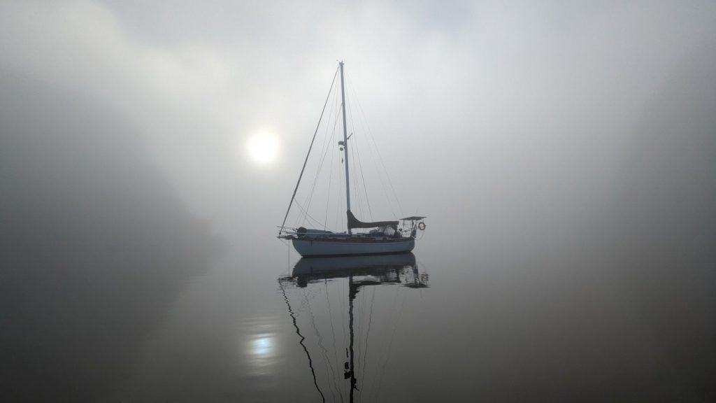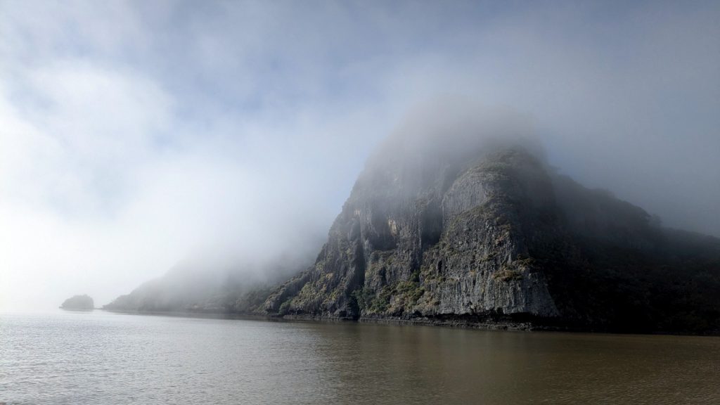 And then it started raining. And raining. And raining! Buckets upon buckets of rain, plus the wind had arrived as scheduled and blew hard for a couple days as well. All of a sudden, New Zealand was different. Like a light switch was toggled, we went from perfect summer weather just a day ago to a serious amount of wind and precipitation in the foreseeable future. So much so that the water changed color from that amazing clear-teal to murky waste-water brown. Eventually the weather gave up trying to sink Meriwether, and rewarded us with fog and eventual blue skies.