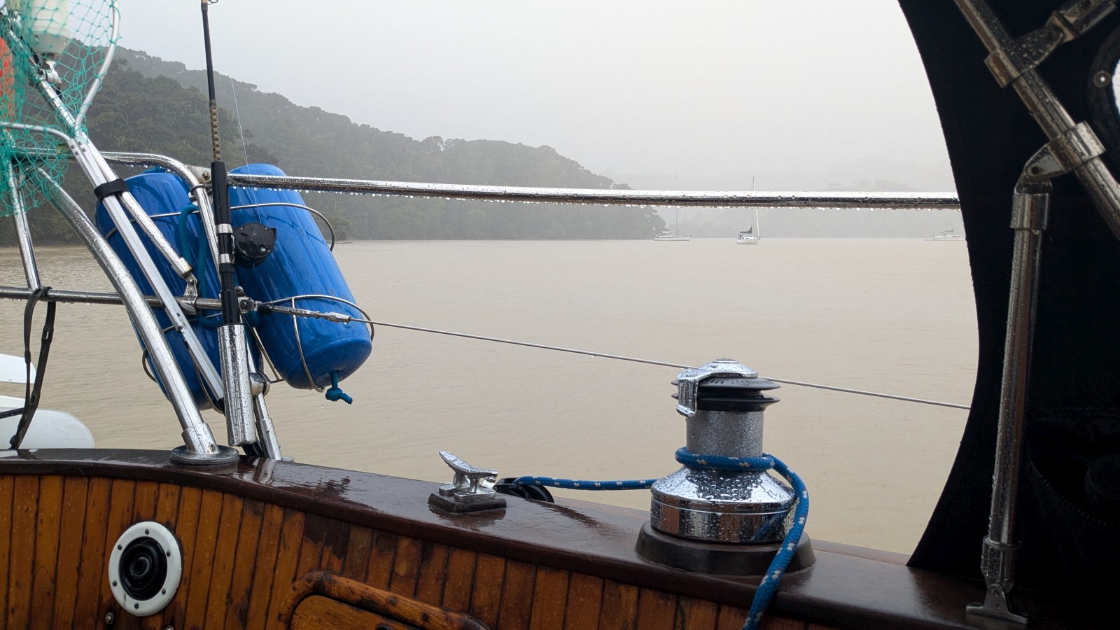And then it started raining. And raining. And raining! Buckets upon buckets of rain, plus the wind had arrived as scheduled and blew hard for a couple days as well. All of a sudden, New Zealand was different. Like a light switch was toggled, we went from perfect summer weather just a day ago to a serious amount of wind and precipitation in the foreseeable future. So much so that the water changed color from that amazing clear-teal to murky waste-water brown. Eventually the weather gave up trying to sink Meriwether, and rewarded us with fog and eventual blue skies.