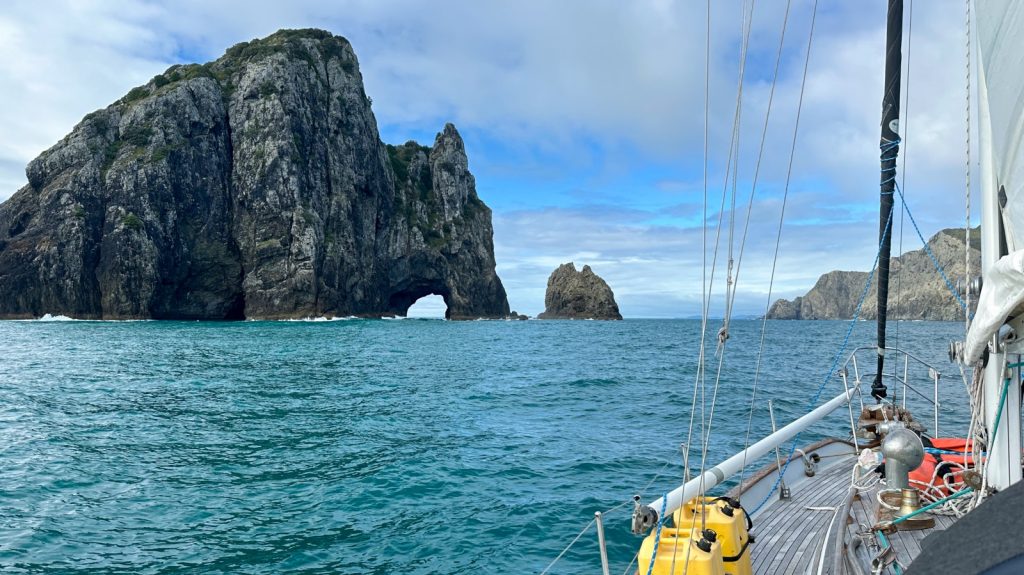 First task was to travel the 80-ish miles along the New Zealand coast line, which lacked a whole lot of safe anchorages along the way. Surely, we could have done it as one long sail – taking about 14 hours total – but we chose to break it up into a few more manageable chunks. Step 1 was just to get back out to Deepwater Cove (1) to stage ourselves for the following day’s milder sea state to venture out into the ocean itself. After a good night of rest, we set off – escorted by dolphins – and rounded Cape Bret and the famous “hole in the rock”. A fair wind carried south for six hours where we once again dropped anchor and overnighted at Whangaruru (2). Another day of good winds and ix hours of sailing brought us down to Tutukaka (3). Along the way we were among a few other boats making the same trek, either North or South. It was practically an Interstate Highway passing by so many other sailboats, but it did provide a little bit of excitement in an otherwise boring sail. With weather beginning to threaten another big blow by the afternoon of day four, we woke very early to knock out the last six hour sail to Marsdon Marina (4).