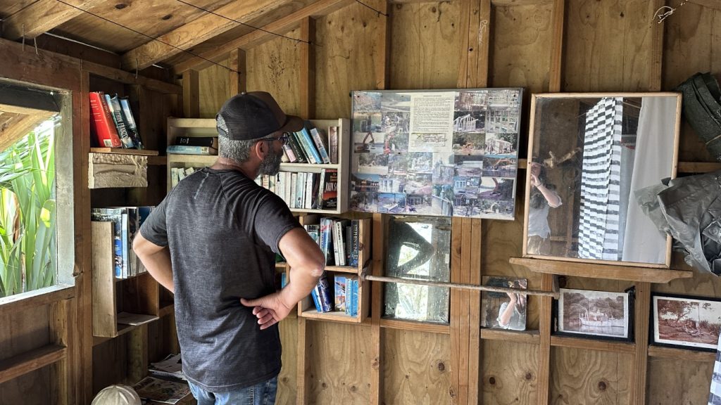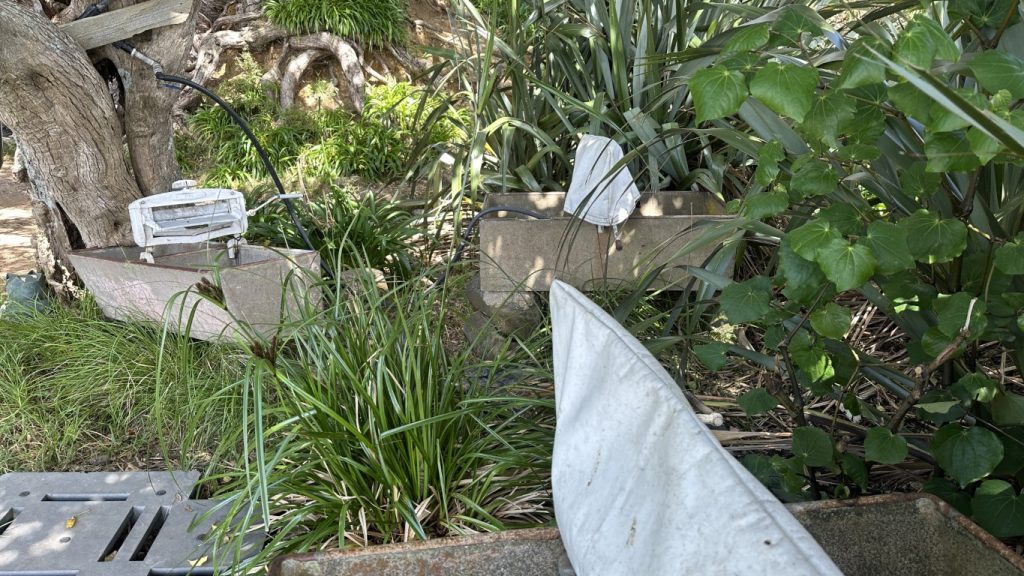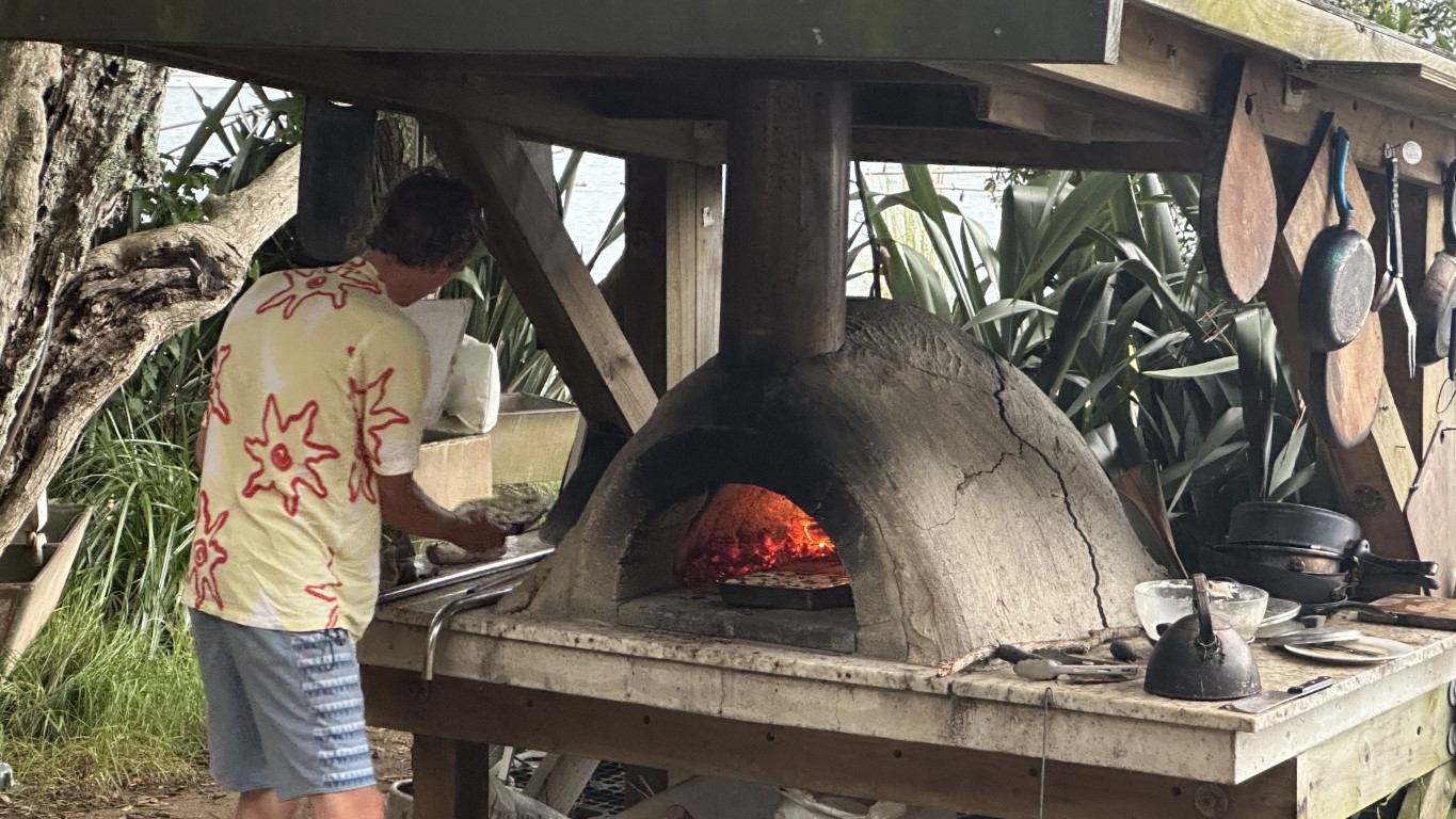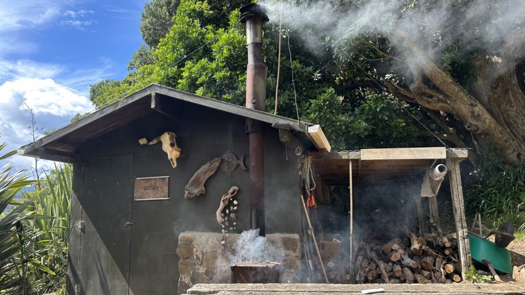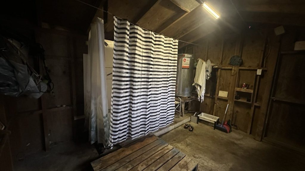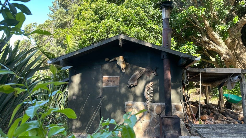 With the boat settled, we dropped the dinghy and went exploring before the weather arrived. Just around the next point were a few alternative anchorages worth checking out in case we needed to move quickly, and not far beyond that was Smokehouse Bay, a place we had heard about more than once. Built by locals for cruisers, it had everything from a wood-fired smokehouse and pizza oven to a bathhouse and even basic laundry facilities. Scattered benches, tables, and a fire pit rounded out the setup, making it clear why it’s such a popular stop in the area.