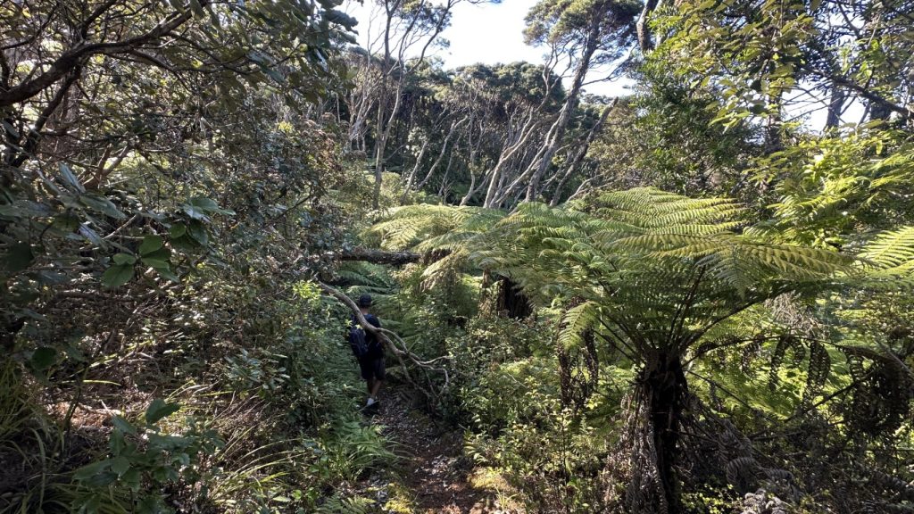 The trail began innocently enough, leading us to the valley floor and following what was supposed to be a lively creek. In my head, I had already pictured clear water, birds, maybe even a few moments of actual wilderness serenity. What I had not pictured was my wardrobe choice. Shorts turned out to be a mistake almost immediately. The trail narrowed quickly, the brush closed in, and within minutes my legs were being introduced to every thorny plant on the island. A quarter mile in, the “trail” became more of a suggestion—just faint depressions in knee-high grass sharp enough to slice skin on contact. Another quarter mile later, now scratched and bleeding in multiple places, we made the call to turn around. We never even made it to the river.
