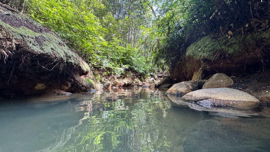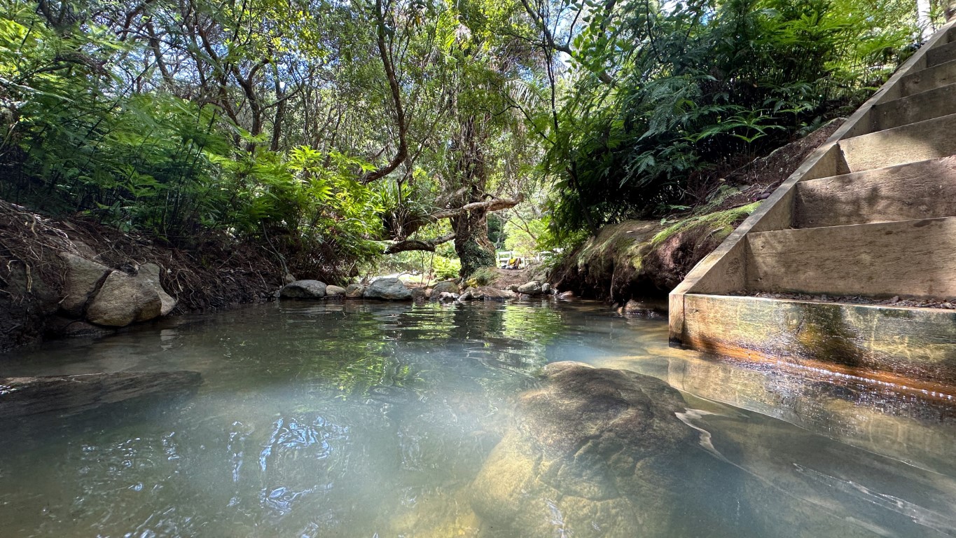 We drove across the island to sort out the prescription, and along the way the rental guy had suggested a couple of “must see” spots. One of them involved hot springs, which meant we were absolutely going. The hike in was about a mile and a half, flat and easy, and—most importantly—free of bloodshed. At the end, tucked into the landscape, were quiet natural hot springs. We soaked for a while, letting the accumulated aches of the past weeks fade out in warm water, and had the whole place to ourselves.