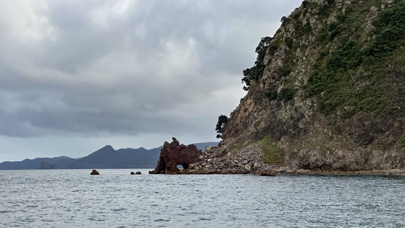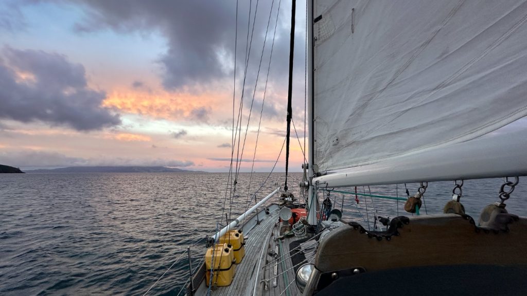 The wind angle made the decision less than ideal. Auckland would have meant running almost dead downwind or jibing our way there—neither option particularly comfortable in rising seas. Whangarei wasn’t perfect either, but it gave us a better line and a clearer plan. By 6 a.m. the anchor was up, sails reefed down in anticipation, and we were already moving out of Tryphena, hugging the northwest coast of Great Barrier Island. For a while, it felt like we had stolen one. High-teen winds, relatively calm seas, and a smooth, fast track up the coast made for fantastic sailing. The chartplotter lit up with AIS targets, and it was clear we weren’t the only ones making a run for it. Boats crisscrossed paths with us, most of them aiming for Auckland, all of us quietly acknowledging the same unspoken thing—time to go.