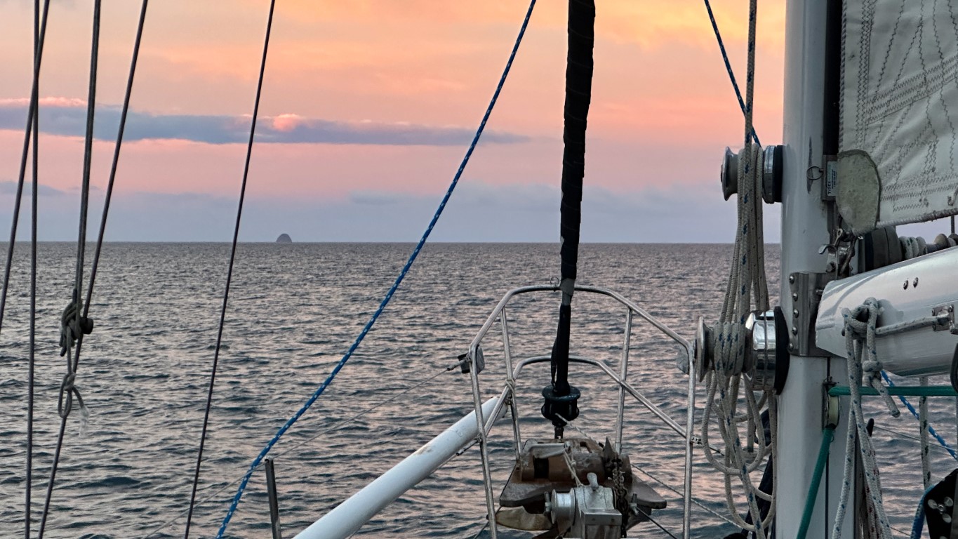 About thirty minutes later, as we cleared the far side of Hen Island, the protection vanished just as quickly as it had arrived. The swell returned, the boat began to roll again, and Kerri was still at the helm while I stayed laid out in the cockpit, not quite ready to take it back over. The problem is, Kerri has earned the nickname “backwards girl” for a reason. Downwind steering has always been a challenge for her—especially keeping track of which way to correct when the wind is pushing from behind—and in the past that’s led to a couple accidental jibes. Those moments rattled her confidence pretty good, which is why I had taken on most of the steering earlier in the day.